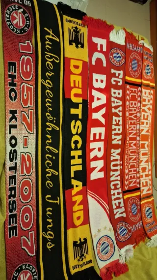 Conjunto de bufandas de fútbol y de la selección alemana. - Bufanda del FC Bayern München con el escudo y nombre del equipo. - Bufanda con el águila de Alemania y Deutschland. - Bufanda con EHC Klostersee 1957-2007 y Außergewöhnliche Jungs.