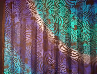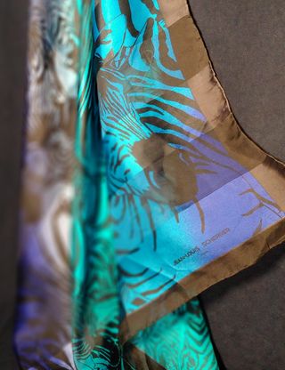 En diferentes gamas de azul y morado. Trama a rayas, transparentes y opacas. Cuadrado 135 cm X 135 cm. Motivo cebras. Ribete negro. Firmado. Muy bonito y vistoso. Pequeño defecto en un hilo. ver foto. #seta #silk #jeanlouisscherrer