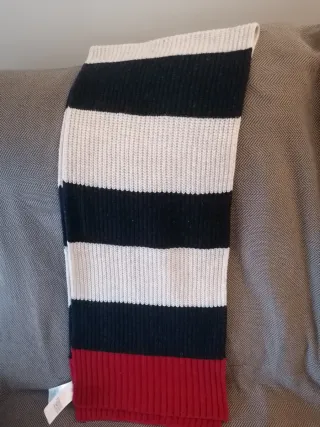 Bufanda de punto con diseño de bloques de color. - Diseño a rayas en rojo, azul marino y blanco. - Tejido acanalado. Medidas 182x36 cms