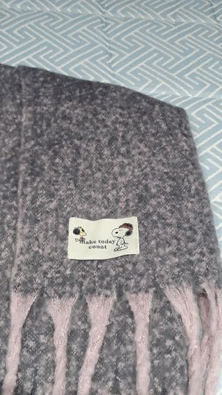 Bufanda larga de la marca Woman's Secret con diseño de Snoopy. Combina tonos grises y rosas, con un acabado suave y flecos. - Diseño bicolor. - Detalle de personaje Snoopy. - Flecos en los extremos.