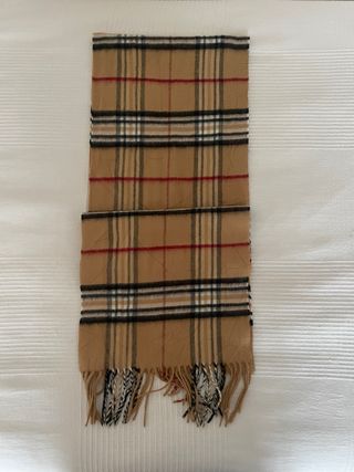 Bufanda clásica con el icónico tartán de Burberry. ES ORIGINAL. Paso más fotos. - Diseño a cuadros en beige, negro, blanco y rojo. - Acabado con flecos en los extremos.