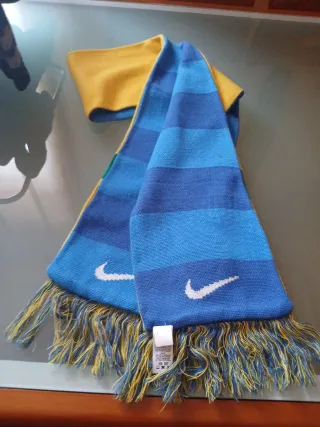 Bufanda con los colores y el escudo de la UD Las Palmas. Ideal para los aficionados del equipo. - Diseño a rayas azules y amarillas. - Escudo del club bordado en el centro. - Flecos en los extremos.