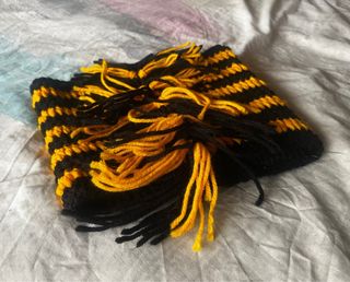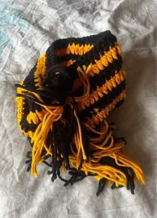 Cuello de lana con un diseño de rayas en negro y amarillo mostaza. Cuenta con flecos que le dan un toque especial.
