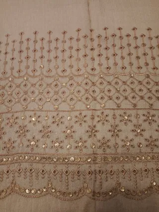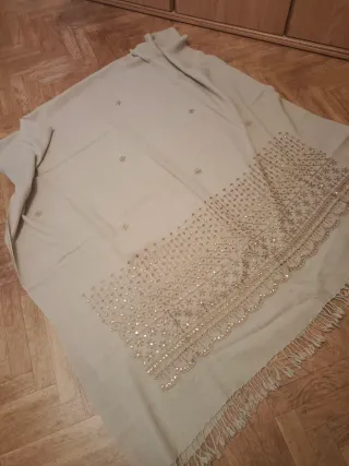 Elegante chal de lana con un delicado bordado. - Material: Lana - Diseño: Bordado con hilos dorados y lentejuelas - Adorno: Flecos en el borde