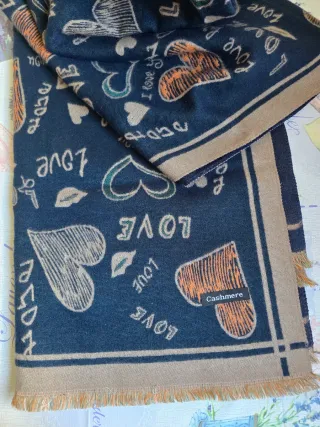 Bufanda de cachemira para mujer con un encantador estampado de corazones y la palabra Love. - Diseño con corazones en tonos beige y naranja. - Base de color azul marino. - Acabado con flecos en los bordes. Muy cálida y suave, perfecta para primavera/otoño o en invierno. Nueva, en perfecto estado.
