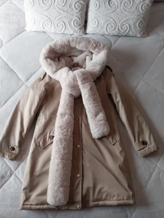 Abrigo de invierno largo en color beige, con un forro interior suave y una bufanda incorporada a juego. - Capucha con ribete de pelo sintético. - Cierre de botones. - Bolsillos frontales. En tienda me costó 109,99€