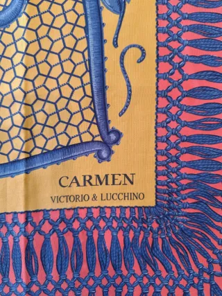 Precioso pañuelo de los diseñadores Victorio y Lucchino con un diseño vibrante y llamativo, se trata de una edición especial del perfume Carmen. Muy raro de encontrar. - Estampado de corazones y flores. - Combinación de colores vivos, azul, coral y amarillo. - Mide 86 x 86