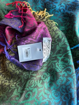 Pañuelo de pashmina con un diseño degradado de colores vibrantes. - Tejido suave y ligero, 100% pashmina. - Estampado floral elegante. - Flecos en los bordes. Está nuevo, con etiqueta.