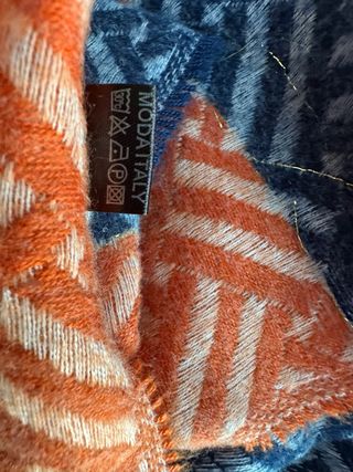 Bufanda de lana con un diseño elegante y moderno. - Tejido suave y cálido. - Patrón de rayas en tonos anaranjados y azules. - Composición: 80% lana, 20% viscosa.