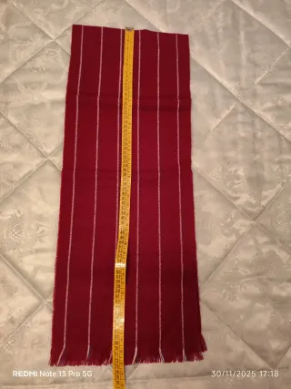 Bufanda de tejido suave con un diseño de rayas verticales blancas sobre fondo rojo. Acabado con flecos en los extremos.
