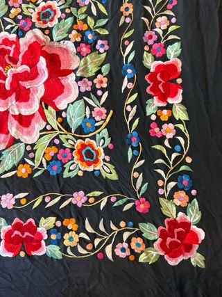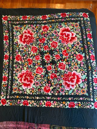 Elegante Mantón de Manila con un intrincado bordado a mano con motivo floral. 150cm x 150cm - Diseño con grandes rosas rojas y flores multicolores. - Adornado con un borde de flecos. - Ideal como accesorio de moda o decoración.