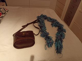 Bolso marrón y una especie de bufanda azul.