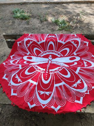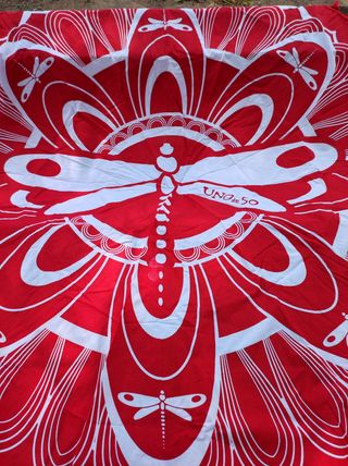 Foulard redondo de la marca española Uno de 50 modelo Libélula con dibujo de mandala de tela en color rojo con mítico corazón de la marca en el centro. Mide 1'75m. de diámetro y termina en borlas de hilo rojo. Ideal para llevar a la playa este verano! Envío a cargo del comprador. No se admiten devoluciones.