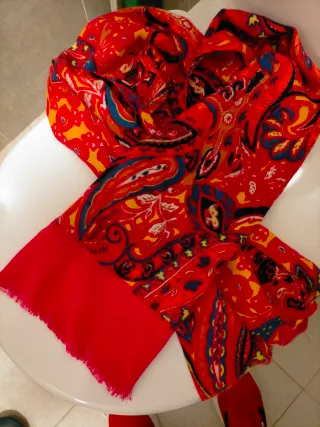 Fular con un diseño étnico vibrante y llamativo. - Estampado paisley. - Tonos rojos y amarillos predominantes. Poco usado, colores fuertes, muy combinable, estilo Oiliy. Abriga bastante