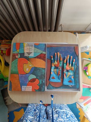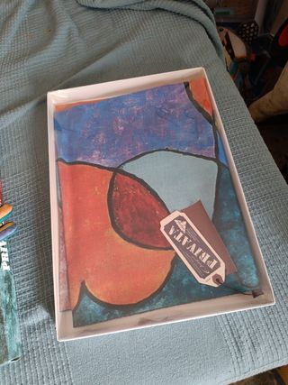 Bufanda y guantes de la marca Privata. Con obra de arte impresa "Jardín de la Cabaña en Persona" 1933 de Paul Klee - Diseño único y colorido. - Incluye una bufanda y un par de gu antes. - Perfecto estado. Sólo se han usado los guantes una vez, bufanda nueva