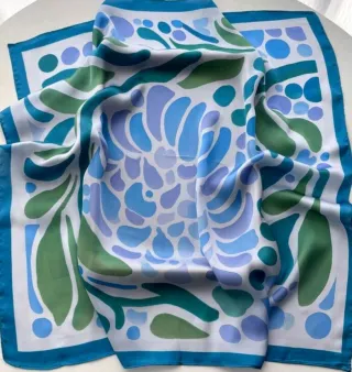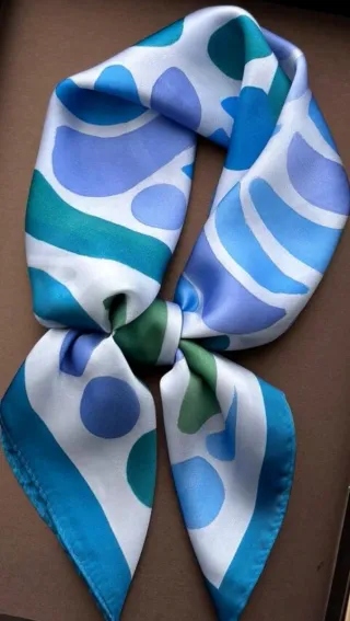 Pañuelo de cuello con un diseño moderno y llamativo. - Estampado con formas orgánicas en tonos azules y verdes. - Tejido satinado con brillo. - Ideal para complementar cualquier atuendo.