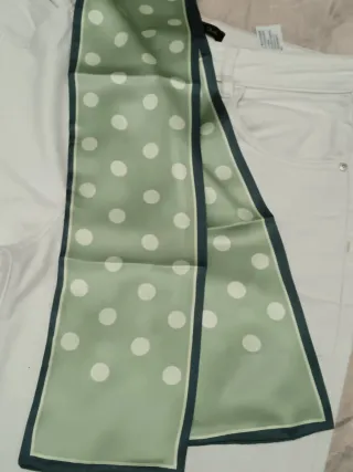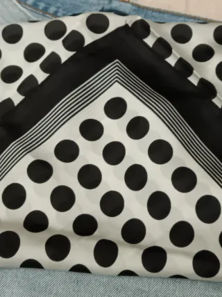 Elegante pañuelo de cuello con un diseño clásico de lunares. - Estampado de lunares negros sobre fondo blanco. - Detalle de rayas en las puntas. - Tejido satinado.