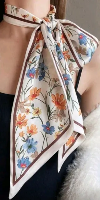 Elegante pañuelo de cuello con un delicado estampado floral. - Diseño con flores en tonos beige y detalles dorados. - Acabado satinado que aporta brillo. - Ideal para complementar cualquier atuendo.