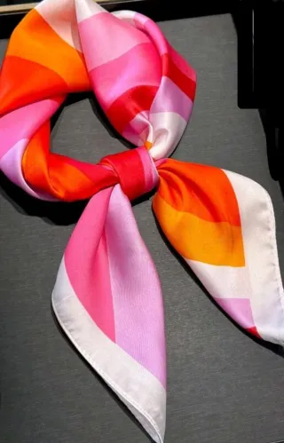 Pañuelo de cuello con un diseño vibrante y moderno. Perfecto para añadir un toque de color a tu atuendo. - Estampado abstracto con formas orgánicas. - Tonos de rosa, amarillo y verde. - Acabado satinado.