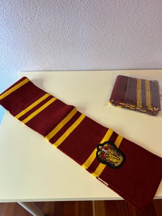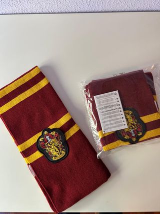 Bufandas (2) de la casa Gryffindor de Harry Potter. Ideal para fans de la saga. Se venden juntas (20 €) o por separado (10 €). - Diseño a rayas rojas y doradas. - Escudo de Gryffindor bordado.