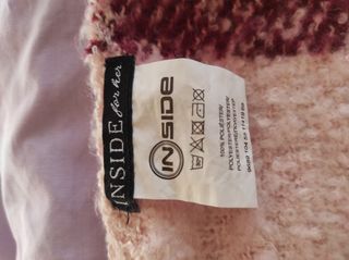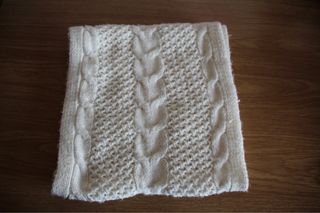 Bufanda estilo cuello con un diseño tejido. Tejido con trenzas. Textura de red en el centro. Tiene algún enganche pero no se ve. Ancho: 27 cm Largo: 60 cm