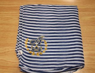 Pañuelo con un diseño de rayas horizontales en tonos azules y blancos. Presenta un detalle bordado en una esquina. - Diseño de rayas. - Detalle bordado en la esquina.