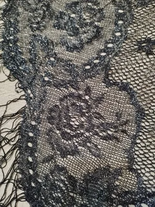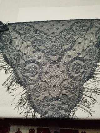 Se vende mantilla grande, finales de los años 80, que conserva su apresto. Mide aproximadamente 2,25 de largo por 1,25 de ancho. Un solo uso, pero sufrió un enganche, está restaurada, pero puesta no se aprecia. Se escuchan ofertas razonables.
