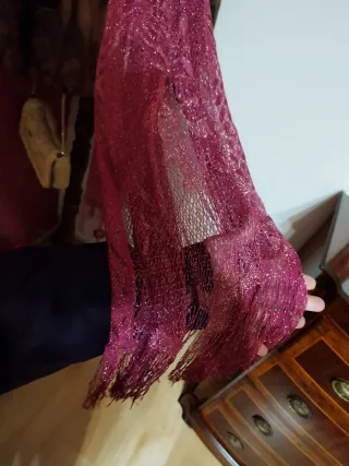 Elegante chal en tono burdeos con detalles brillantes y flecos. - Tejido con hilos metalizados. - Diseño calado. - Flecos en los extremos.