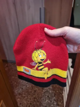 Conjunto de gorro y bufanda con diseño de Maya la Abeja. - Gorro de punto rojo con detalles. - Bufanda a juego con estampado. - Personaje de Maya la Abeja.