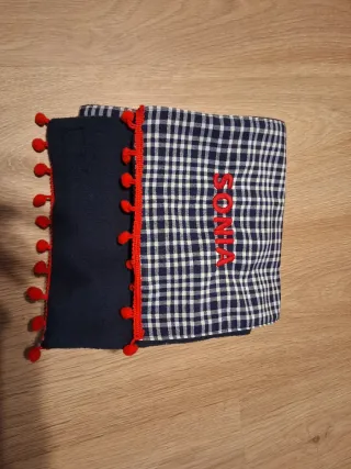 Bufanda con diseño de cuadros y detalles. - Adornada con pequeños pompones rojos. - Borde decorativo rojo. - Bordado con el nombre SONIA en hilo rojo.
