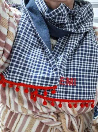 Bufanda con diseño de cuadros, ideal para trajes regionales. De algodón 100%,confeccionada por modista particular.Mide 160 cm de larga y 26 cm de ancho y está cosida con tejido doble,sin estrenar. - Adornada con pompones en el borde de color azul marino. - Tejido de cuadros azul y blanco.