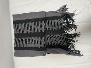 Bufanda ligera con un diseño de rayas en dos tonos de gris y negro. Perfecta para añadir un toque de estilo a tu atuendo. - Diseño de rayas. - Acabado con flecos en los extremos.