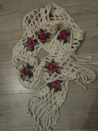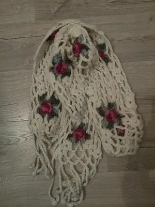 Bufanda de lana tejida con un diseño abierto y adornada con flores crochet. Color marfil y flores en rosas y verdes. 252 cm de largo (incluidos los flecos) x 16 cm de ancho . No tiene etiquetas