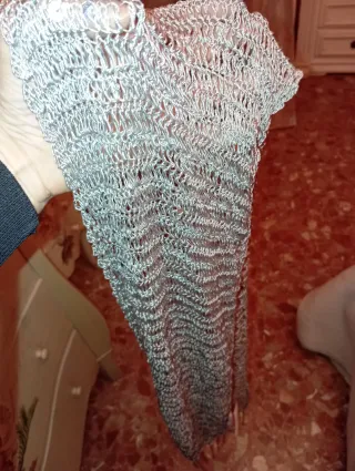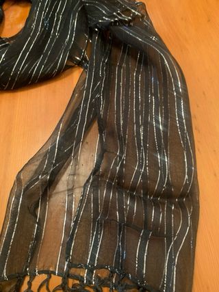 Elegante chal de la marca Lola Casademunt (Barcelona ), con un diseño tejido y adornado con lentejuelas. 100% viscosa. Sin estrenar, aún con la etiqueta. + Fular satín plisado, color plomo, marca Punto Roma, también por estrenar, aún con la etiqueta. + Pañuelo grande de Roma. Todo por 10€ Precio original de chal + fular (está en las etiquetas): 39'95€