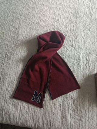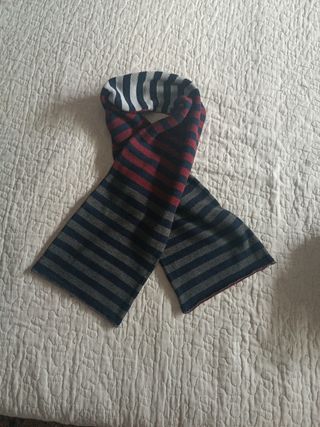 Bufanda reversible para niño, tallas 4-6 años. Una es de color rojo con un detalle de inicial bordada y la otra cara es a rayas azul, gris y rojo. Esta en buen estado y son perfectas para el invierno. - Reversible. - Dos diseños diferentes. - Talla 4-6 años.