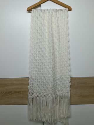 Bufanda, grande, artesanal, vintage (1970-1980). Composición lana. Color blanco. Tejido intrincado con detalles calados. Flecos largos en los extremos. 170 cm de largo x 50 cm de ancho. Sin etiqueta.