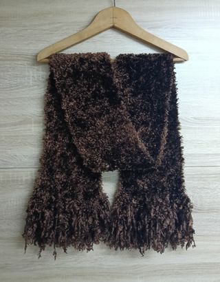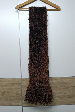 Bufanda de color marrón con reflejos claros, vintage, años 1980-2000. Material: poliéster. Suave, pomposa y en buen estado. Flecos en las puntas. Tamaño: 184 cm de largo x 18 cm de ancho.