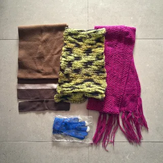 Conjunto de accesorios de invierno. - Tres bufandas de diferentes texturas y diseños. - Dos de las bufandas hechas a mano. - Un par de guantes de punto a estrenar.