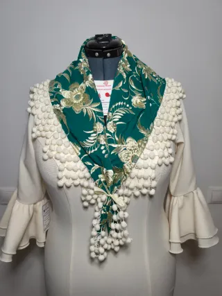NO NEGOCIABLE PRODUCTO ESPAÑOL Fabricación propia Mantón de flamenca con un diseño elegante y detalles de madroños. - Adornado con bordados tostados- dorados sobre fondo verde. - Incorpora madroños beis crudo alrededor del borde y en la caída. - Cierre con lazada de tela.