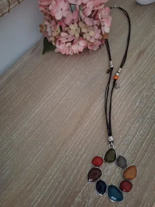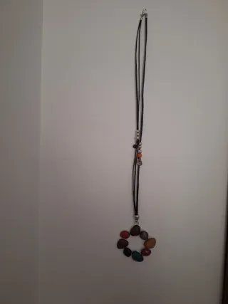 Collar largo con un diseño circular adornado con piedras de diversos colores. Diseño étnico y bohemio.