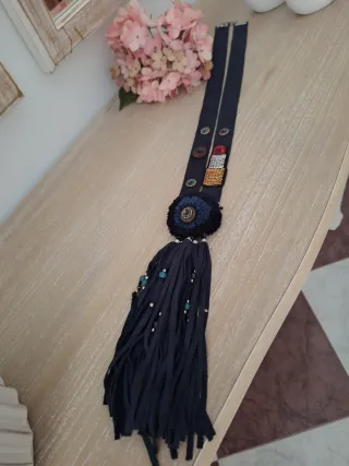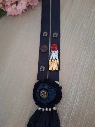 Collar largo de antelina azul marino con detalles decorativos. Nuevo.