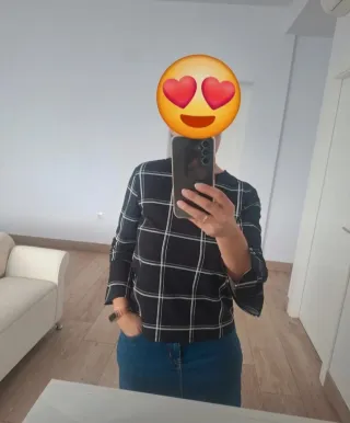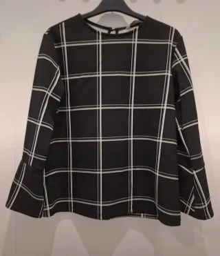 Blusa elegante con estampado de cuadros. Talla S, perfecta hasta talla 40. - Diseño de manga acampanada. - Cuello redondo.