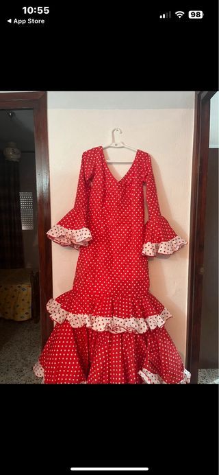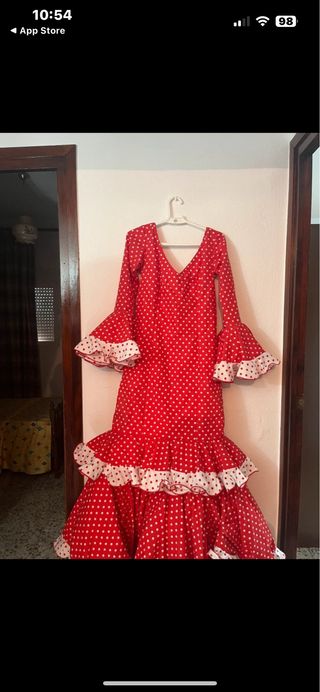 Vestido de flamenca con un diseño clásico y alegre. - Estampado de lunares blancos sobre fondo rojo. - Mangas acampanadas con volantes. - Volantes en la falda.