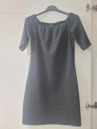 Vestido negro con un diseño moderno y favorecedor. Talla única, perfecta hasta 38. - Escote Bardot. - Tejido con textura. - Manga corta.