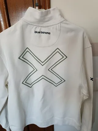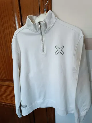 Sudadera blanca con cuello alto y detalle de cremallera. - Diseño moderno con logo en el pecho. - Puños y bajo elásticos.