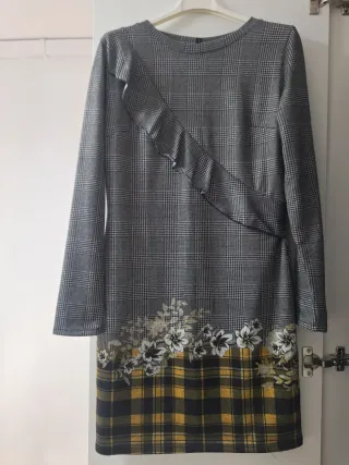 Vestido de cuadros con un diseño moderno y detalles llamativos. - Estampado de cuadros en gris y amarillo. - Adorno de volantes en la parte delantera. - Bajo con estampado floral y cuadros.