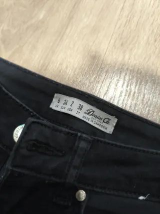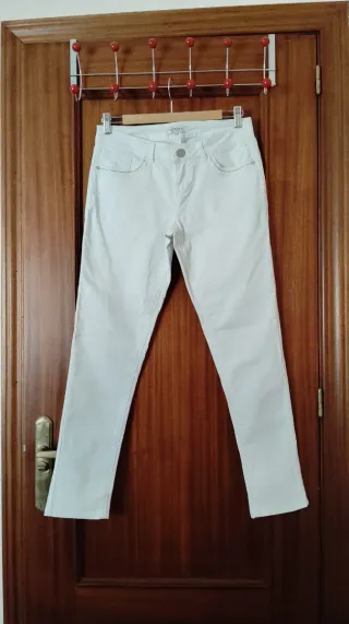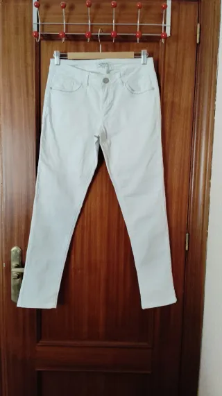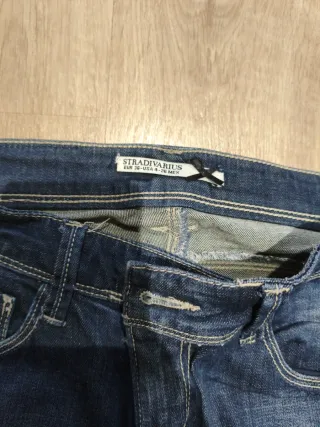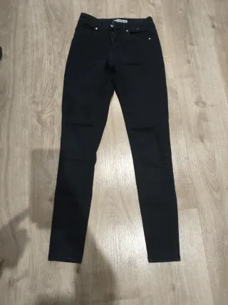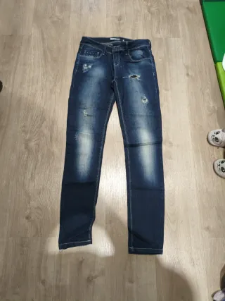 Pantalón vaquero de corte ajustado con un diseño moderno. Nuevos. Son talla S, pero la recomiendo para XS. - Bolsillo delantero adornado con pedrería. - Cierre de botón y cremallera. - Efecto desgastado sutil.