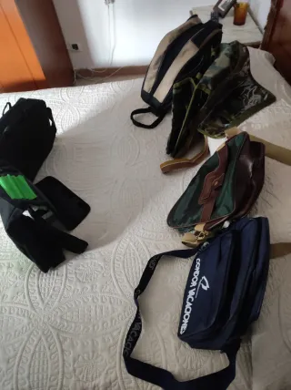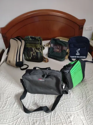 Lote de mochilas y bolsos de diferentes estilos. - Mochila beige y negra. - Bolso camuflaje. - Bolso verde y marrón. - Bolso azul con logo. - Bolso negro con logo Optoma. - Bolso negro y verde.