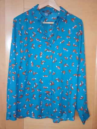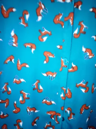 Camisa de manga larga con un divertido estampado de zorros en color naranja y blanco sobre un fondo azul verdoso. - Cuello camisero. - Cierre de botones. - Puños abotonados.