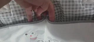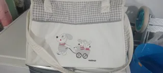 Práctica bolsa de hospital con un adorable diseño. - Estampado de un perro tirando de un carrito con ratones. - Parte superior con estampado de cuadros grises. - Asa larga para llevar al hombro. Usada en una ocasión Lleva por fuera 2 bolsillos y por dentro otro Plegada no ocupa nada De la marca cambrass